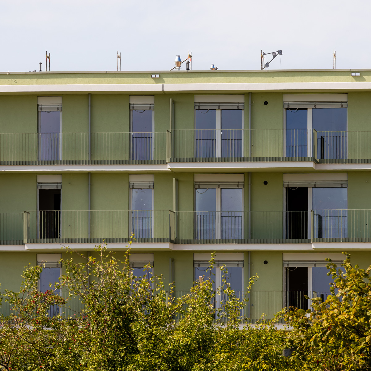 Heizung und Warmwasserbereitung erfolgen zentral mittels am Dach situierter Luftwärmepumpen, weiters wird eine Photovoltaikanlage auf dem begrünten Flachdach errichtet.