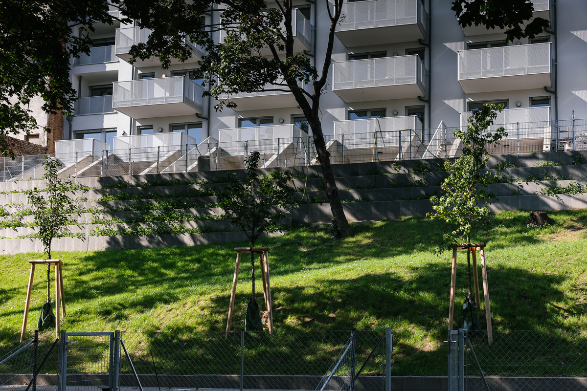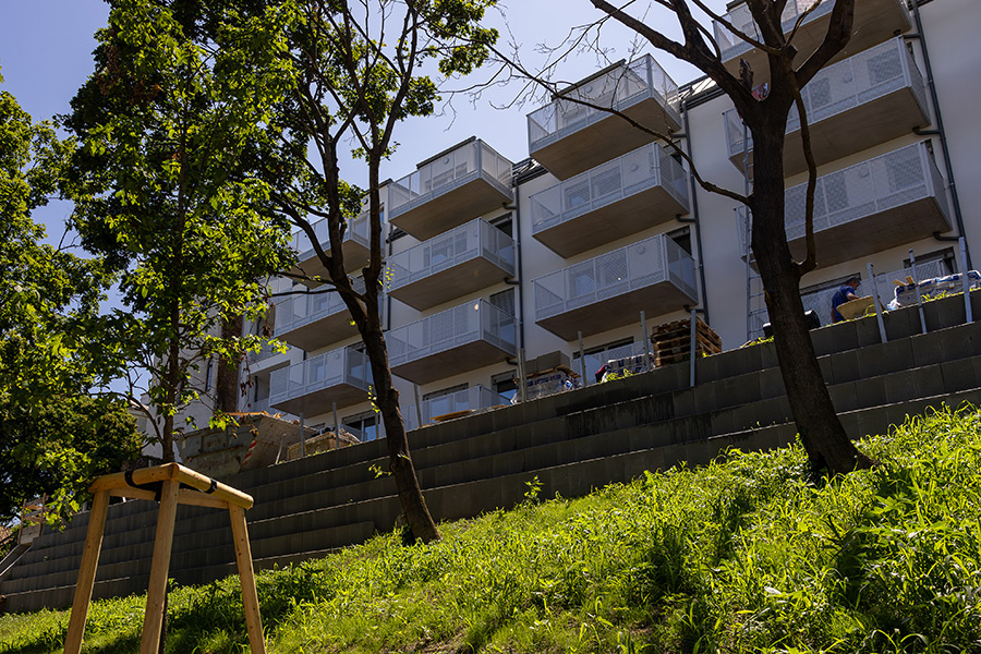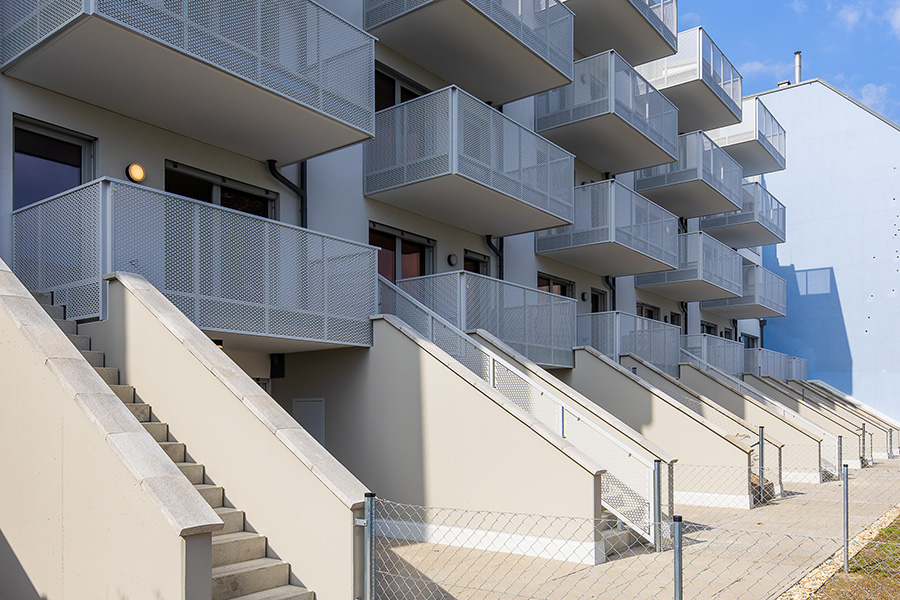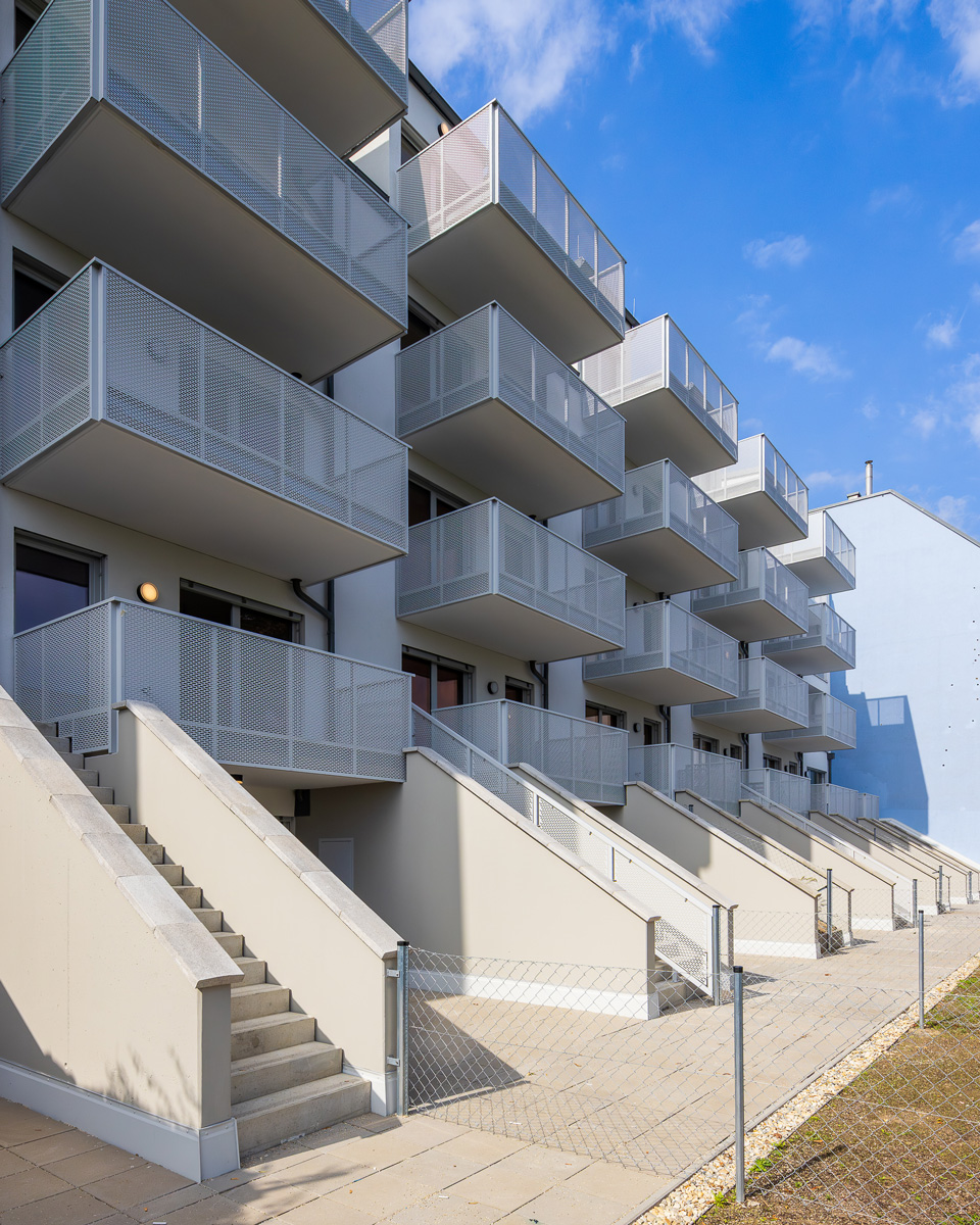 Die Wohnungen im Erdgeschoß verfügen über einen Garten, jene in den oberen Geschoßen sind mit Balkonen, Loggien oder Terrassen ausgestattet.