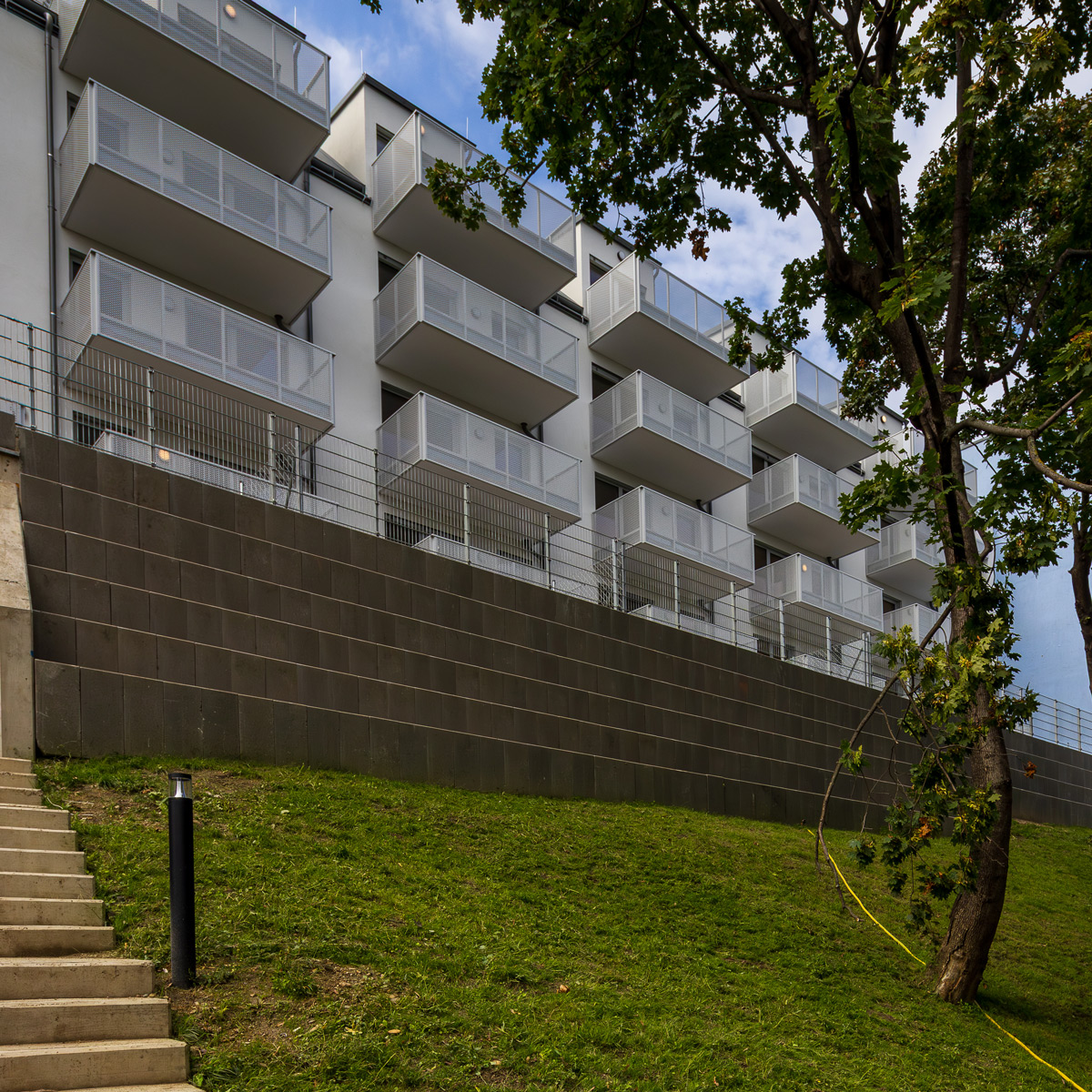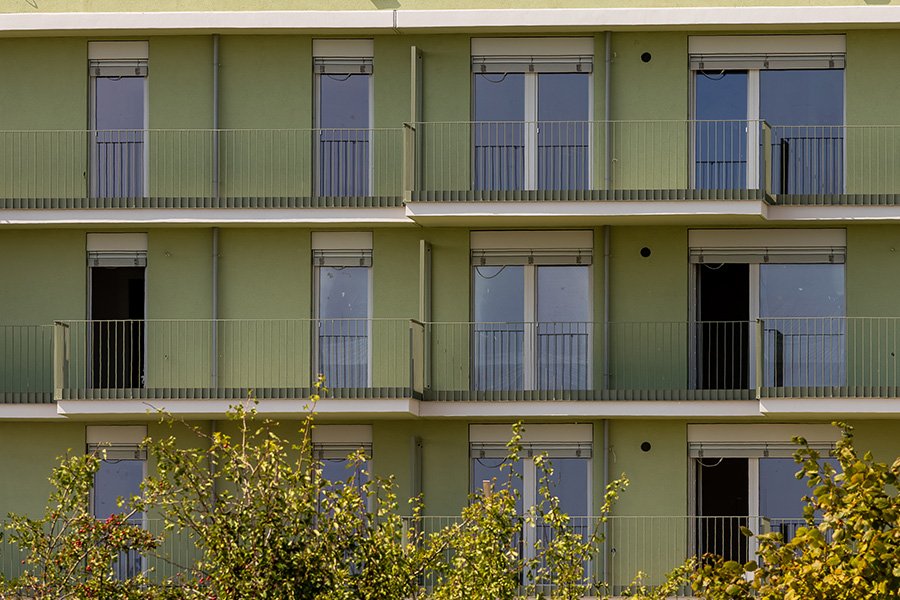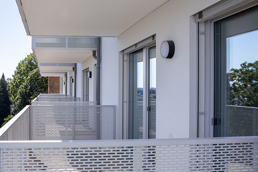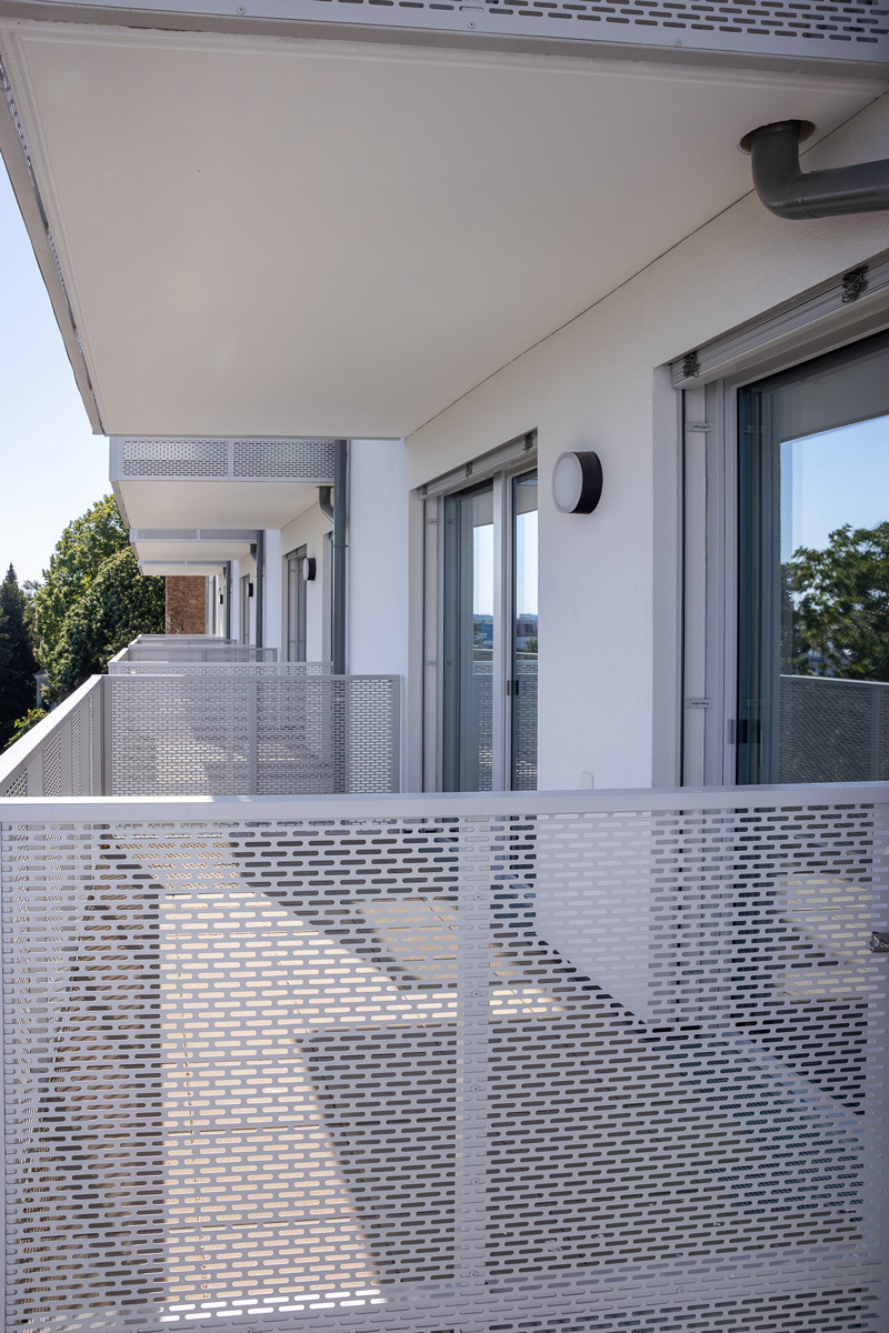 Die Wohnungen im Erdgeschoß verfügen über einen Garten, jene in den oberen Geschoßen sind mit Balkonen, Loggien oder Terrassen ausgestattet.