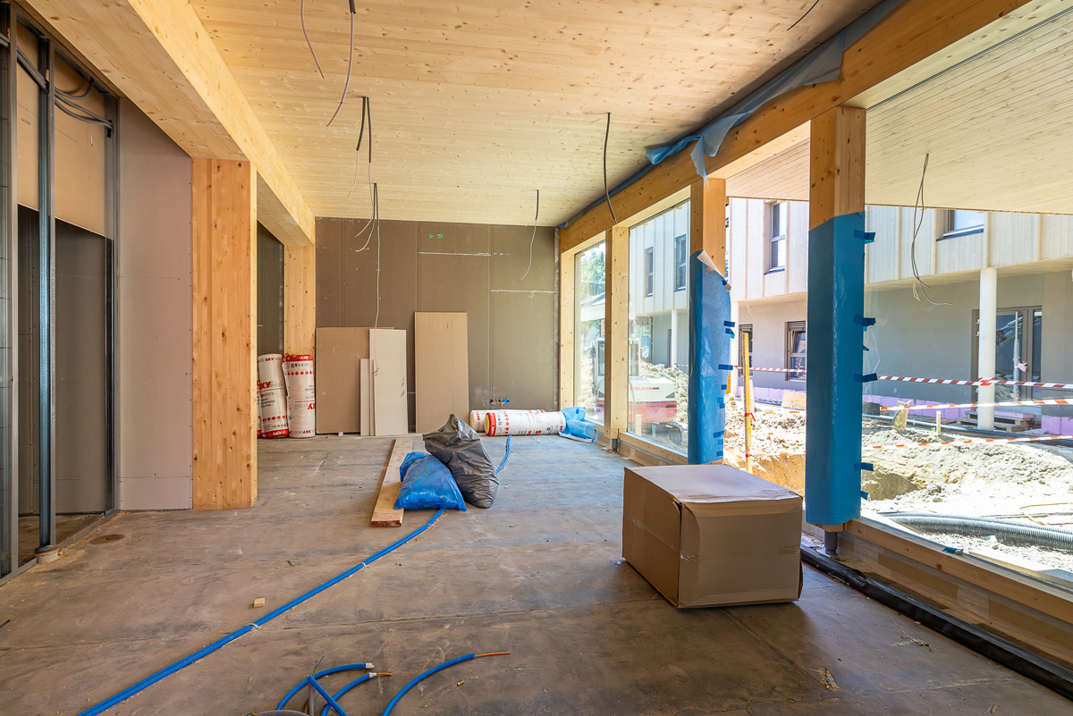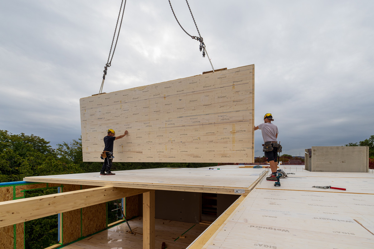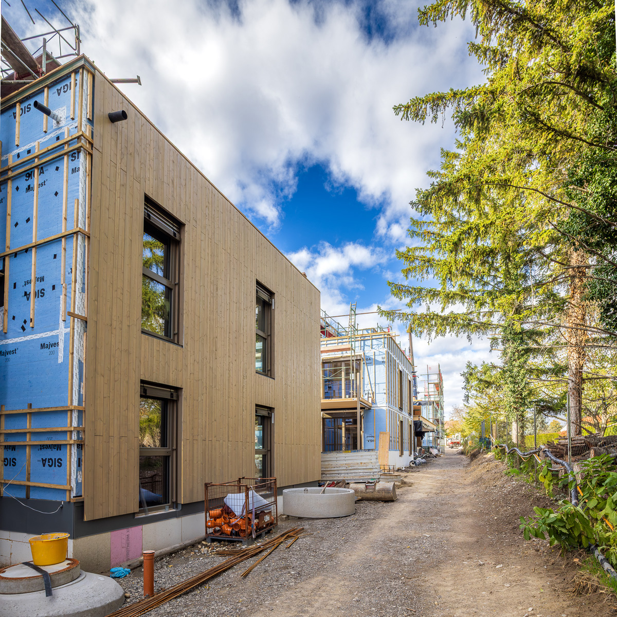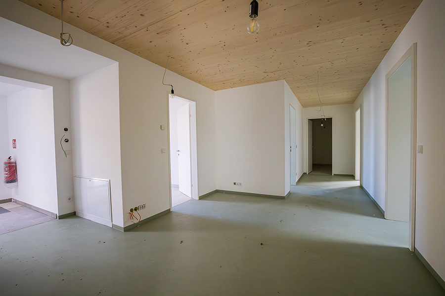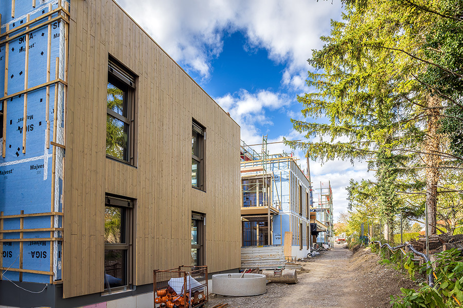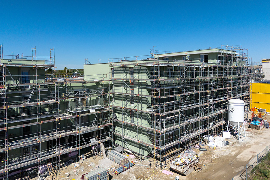Die Wohnungen verteilen sich auf drei Blöcke, die mit hochwertiger Holzbauweise überzeugen und nachhaltigen Wohnkomfort bieten. Der Gewerbeteil beinhaltet zudem eine Bank und eine Apotheke, die eine ideale Nahversorgung für alle zukünftigen Bewohner und die Umgebung gewährleisten. Die Dächer werden größtenteils mit einer Intensivbegrünung gestaltet, die zur Zwischenspeicherung von Niederschlagswasser beiträgt und gleichzeitig einen ökologischen Mehrwert bietet. Zusätzlich werden die Dachflächen für die solare Energiegewinnung mit Photovoltaik-Anlagen ausgestattet, um den CO2-Abdruck des Projekts nachdrücklich zu reduzieren. Alle Räume verfügen über eine moderne Fußbodenheizung, die für ein angenehmes Wohnklima sorgt.