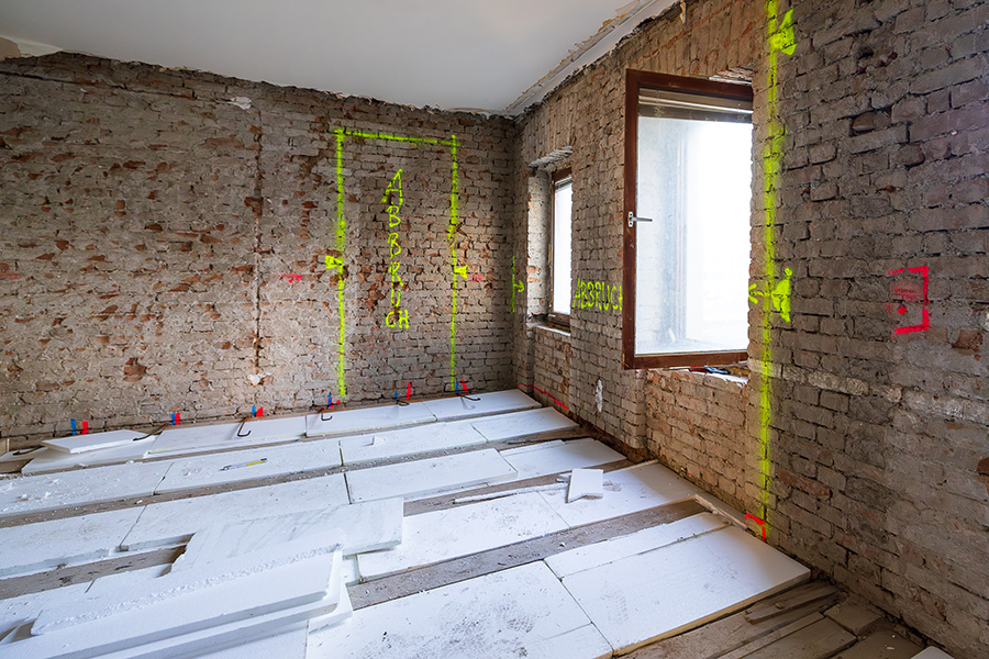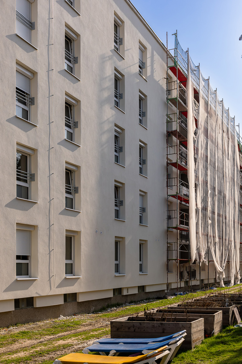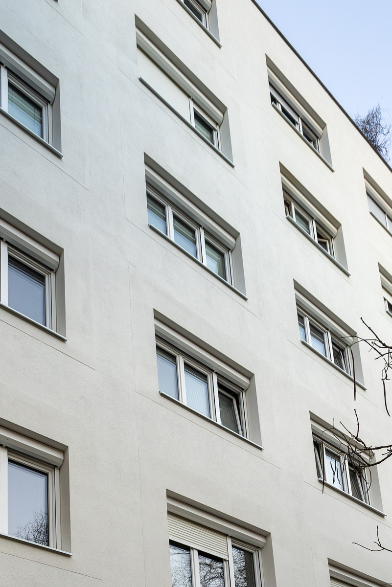 Im Bereich der neu eingebauten Fenster wird die vorhandene Vollwärmeschutzfassade ergänzt bzw. instandgesetzt. Zusätzlich wird die Kellerdecke gedämmt.