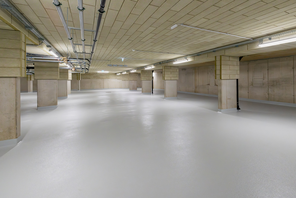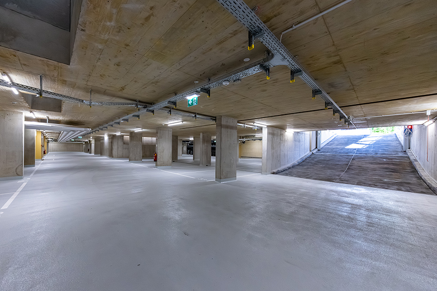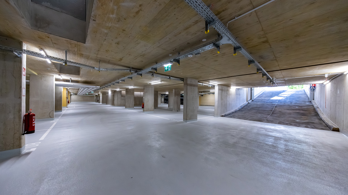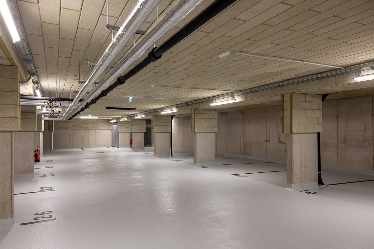 In der eingeschoßigen Tiefgarage können 104 PKWs untergebracht werden. Das Parkdeck des Nahversorgers bietet Platz für 31 weitere Stellplätze. Ebenfalls im Kellergeschoss befinden sich die Einlagerungs-, Fahrrad- und Technikräume. Die Müllräume, sowie die KIWA-AR sind bequem über einen ebenerdigen Zugang zu erreichen. Die Wohnungen erstrecken sich vom Erdgeschoss über 7. Stockwerke bis in das Dachgeschoss.