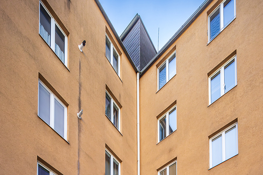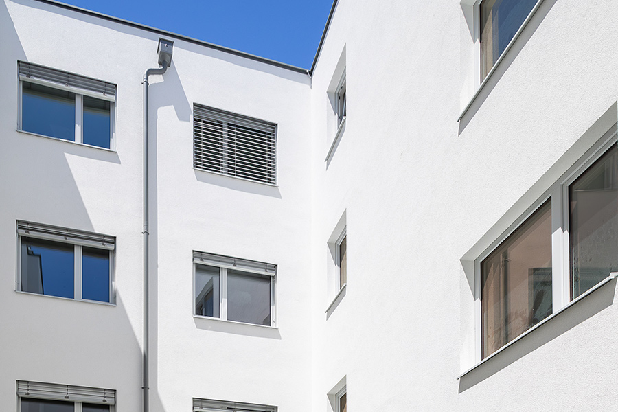 Alle vorhandenen Fenster werden durch neue Kunststofffenster ersetzt und damit sowohl der Wärme- als auch der Schallschutz deutlich verbessert. Die Fassade des Gebäudes wird neu ausgeführt und mit einem Vollwärmeschutzsystem aus 20 cm Mineralwolle versehen. Darüber hinaus wird das Dach zur Gänze neu errichtet und eine neue Blitzschutzanlage installiert.