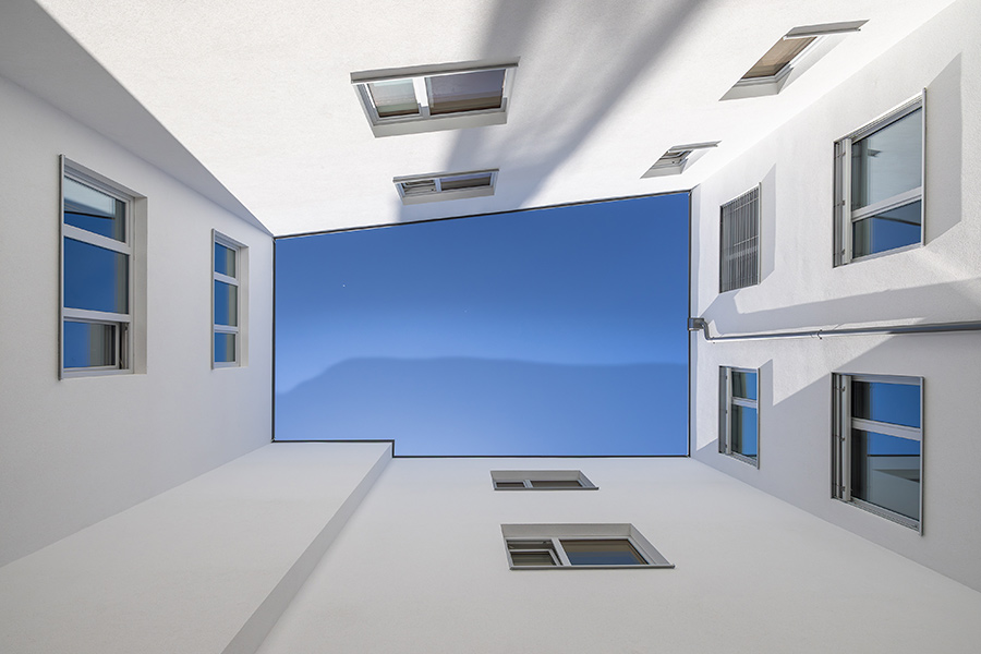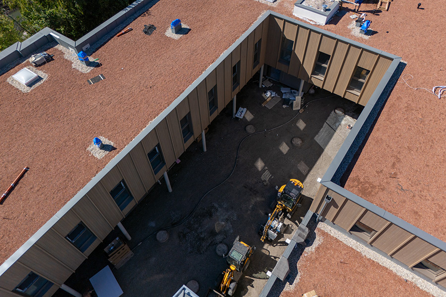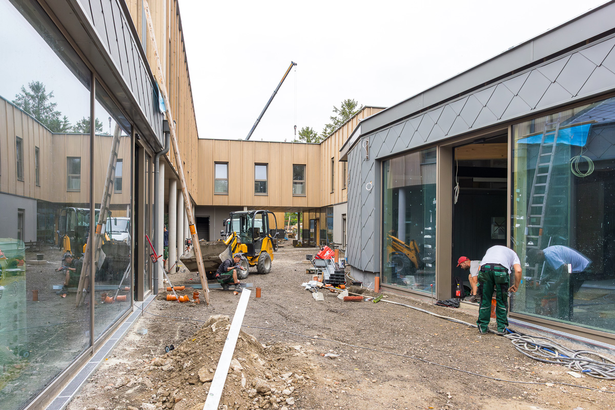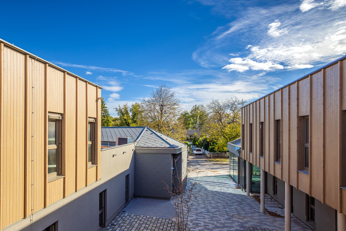 Die Bauteilaktivierung (Deckenheizung und -Kühlung) wird mittels Erdwärme-Tiefenbohrungen und den dazugehörigen Wärmepumpen betrieben. Durch die Ausführung von Versickerungsmulden erfolgt die Entwässerung der Dachflächen auf dem eigenen Grundstück. Die restliche Freifläche bietet Platz für Spielgeräte, Eigengärten, sowie Sitzstufen, welche für gesellige Zusammenkünfte einladen.