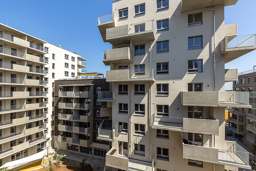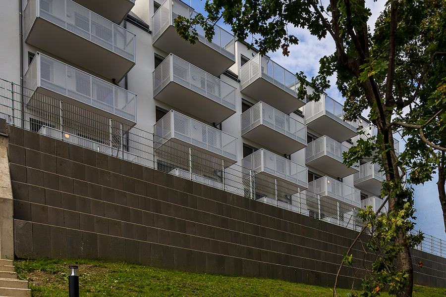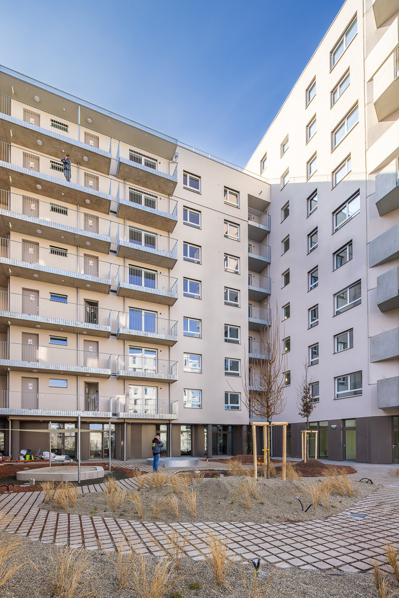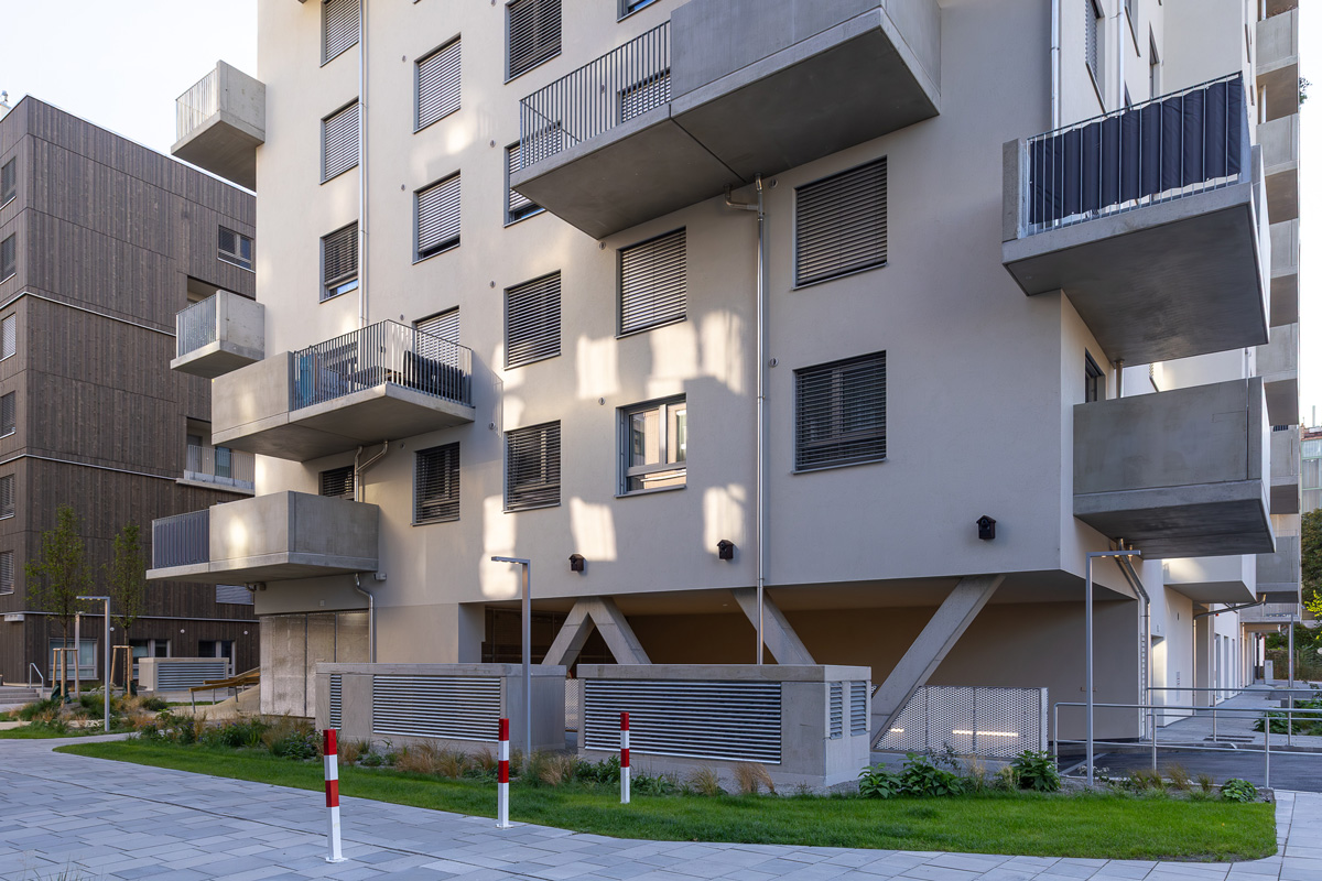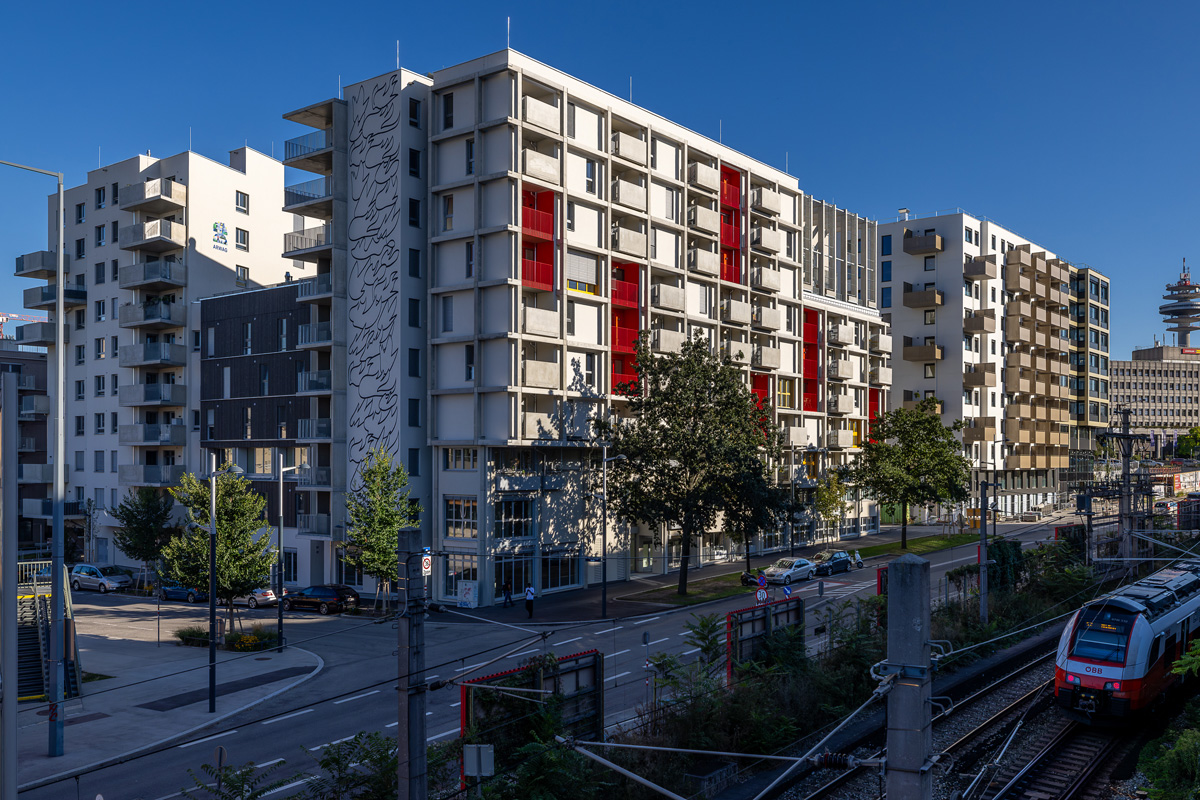 Die Wohnhausanlage beherbergt 1 bis 4 Zimmer Wohnungen mit großzügigen privaten Freibereichen in Form von Loggien oder Balkonen. Um der Anforderung nachhaltig Bauen und Wohnen gerecht zu werden, kommen in diesem Projekt mehrere Methoden zum Einsatz. Zum einen sorgen die begrünten Fassaden für die Verbesserung des Stadtklimas, zum anderen helfen Photovoltaikanlagen am Dach gemeinsam mit der Abwärme aus dem Abwasser warmes Wasser zu erzeugen. Die Ausstattung der Wohnhausanlage mit der Bauteilaktivierung zum Heizen im Sommer und Temperieren im Winter runden das Angebot an nachhaltigem Bauen für dieses Projekt ab.