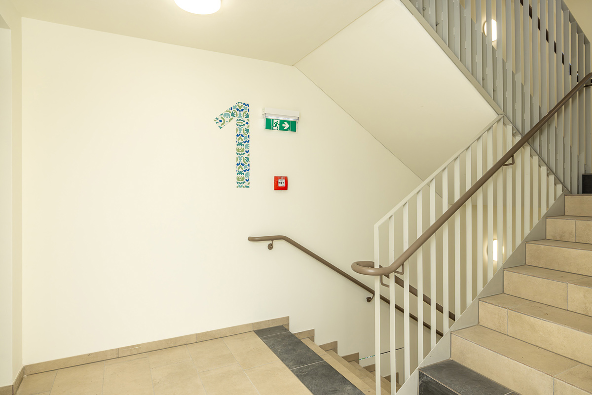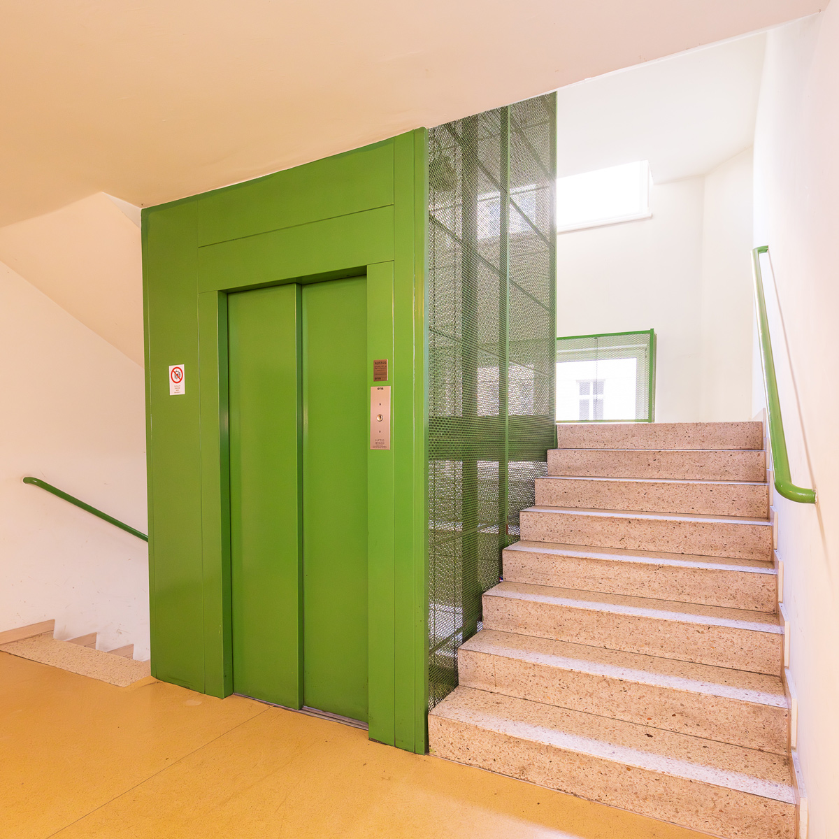 Das Gebäude hat eine Grundrissfläche von ca. 250m2 und besteht aus UG, EG sowie 5 OGs. Es bietet Platz für rund 50 Wohneinheiten/Bewohner.