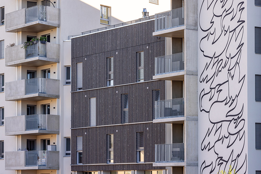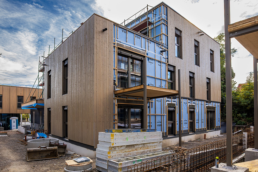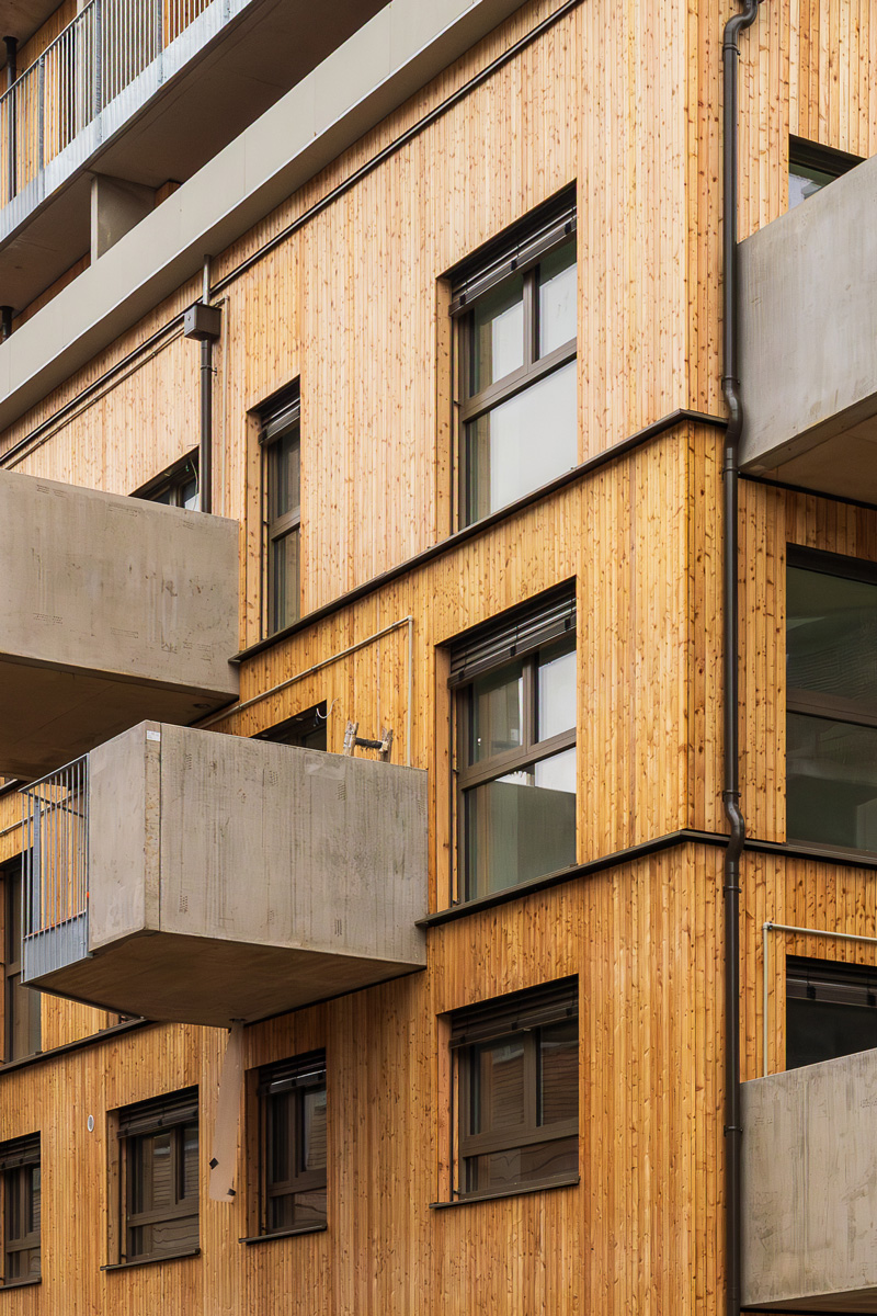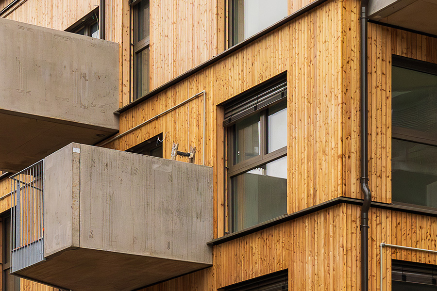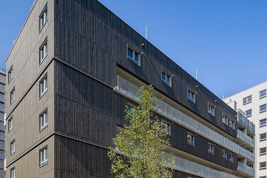 Die Wände werden zum Teil in Holzbauweise und zum Teil in Massivbauweise ausgeführt. Als grüner Mantel sind verschiedene Formen der Fassadenbegrünung vorgesehen. Jeder Bewohner erhält eine Baumpatenschaft für einen Baum auf seinem Balkon, welche mittels eines intelligenten Regenwassermanagements in Trockenperioden mit Wasser versorgt werden.