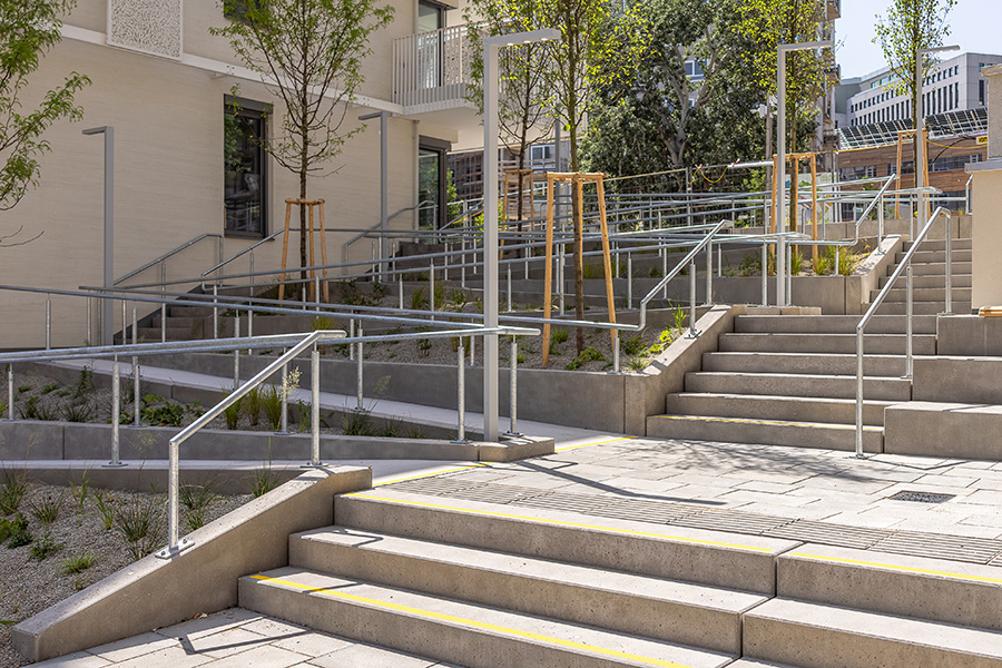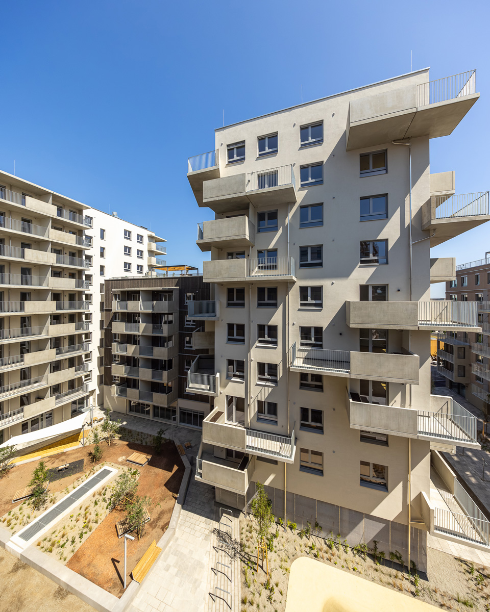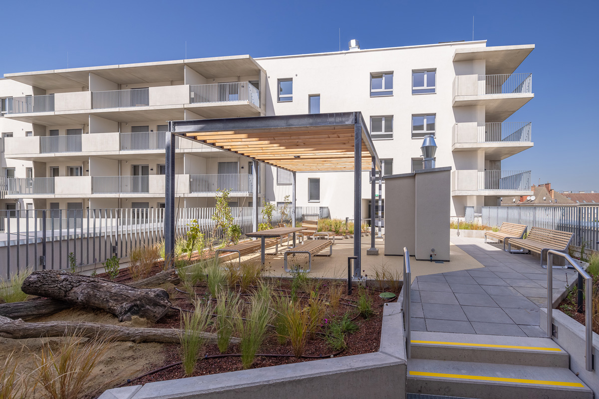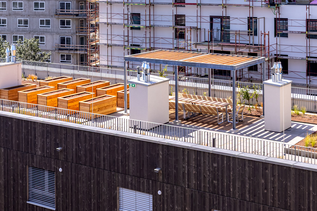 Das Bauprojekt verfügt weiters über einen Spielplatz im Innenhof, eine Gemeinschaftsterrasse im 4.OG und Bienenstöcke im 8.OG, welche vom Verein Stadtbienen angesiedelt und betreut werden.