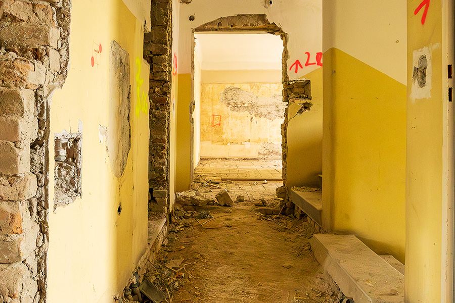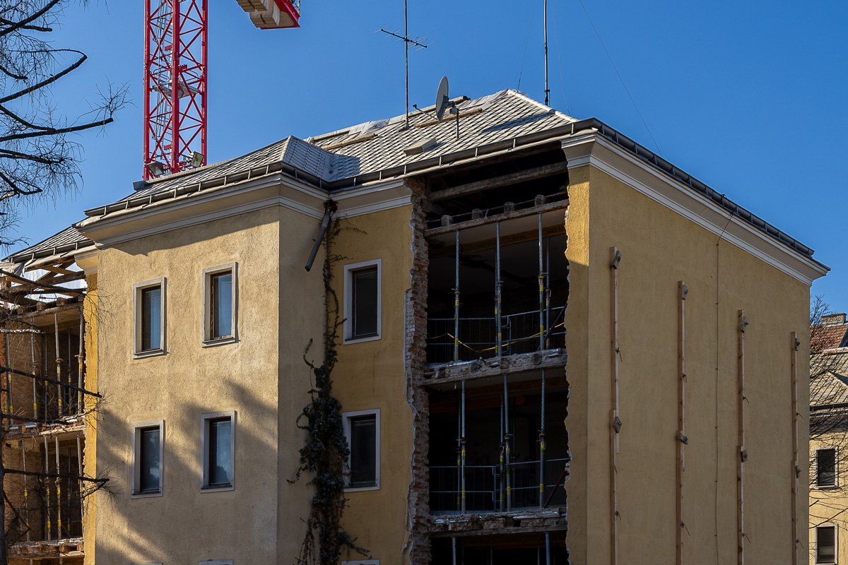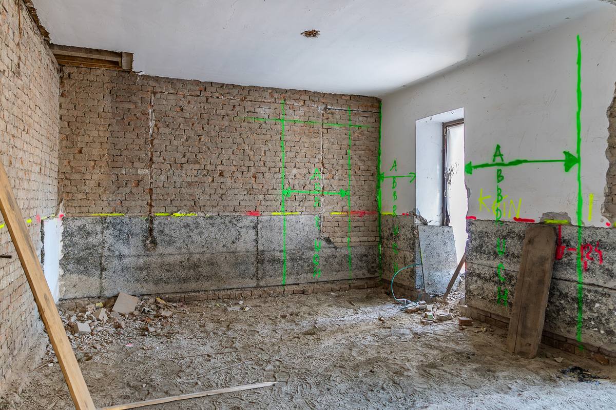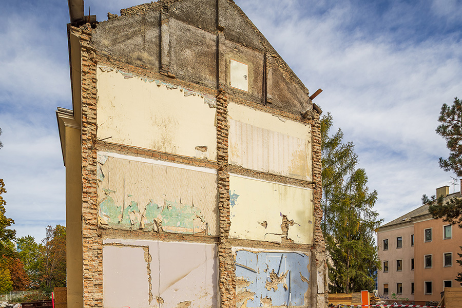 Nach dem Abbruch baufälliger Gebäude auf dem Grundstück wird ein verbleibender Teil der Bestandsbebauung in den zu errichtenden Neubau integriert, im Inneren revitalisiert und außen saniert.