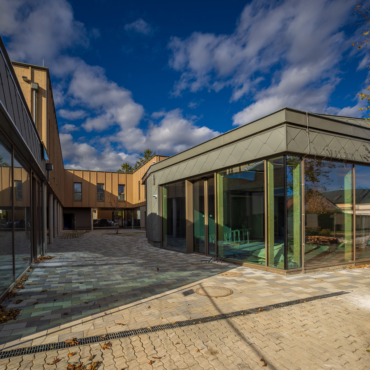 Mittels Erdwärme-Tiefenbohrungen und den dazugehörigen Wärmepumpen wird die Bauteilaktivierung (Deckenheizung und -temperierung) betrieben. Zusätzlich wird auf der Dachfläche eine Photovoltaikanlage zur Erzeugung von umweltbewusstem Strom errichtet. Durch die Umsetzung eines Versickerungskonzeptes erfolgt die Entwässerung der Regenwässer auf dem eigenen Grundstück. Die restliche Freifläche bietet Platz für Spielgeräte, Eigengärten, einem Calisthenicbereich und einem Bocciafeld.