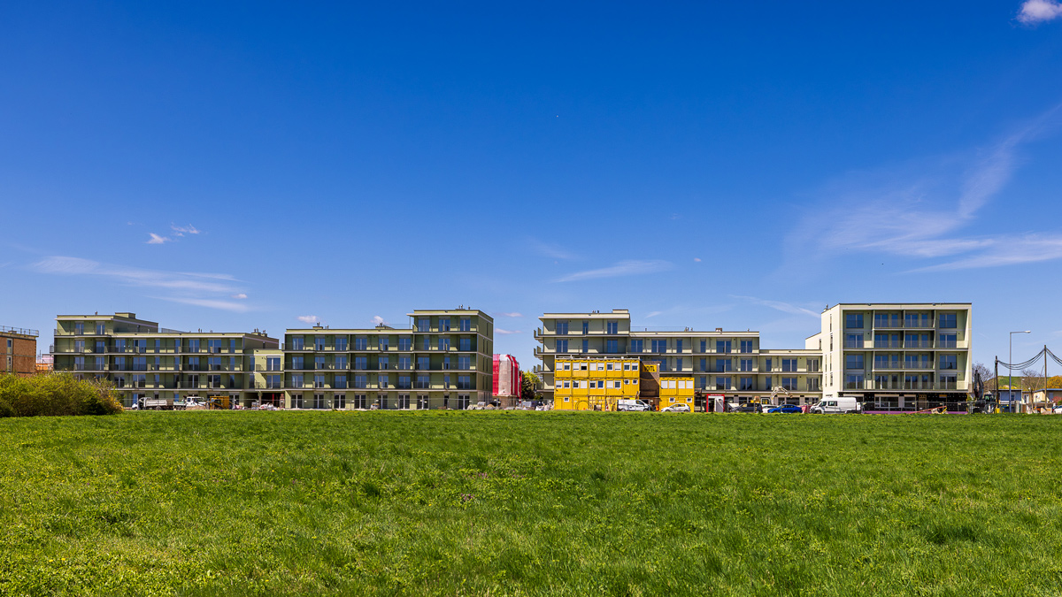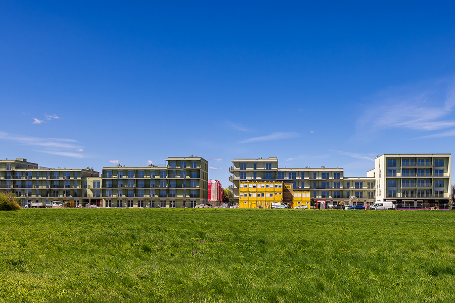 Auf dem Gelände entstehen 100 Mietwohnungen, ein Kindergarten und eine Tiefgarage mit 69 Stellplätzen. Sämtliche Wohnungen im Erdgeschoß sind mit Terrassen und die restlichen Wohnungen in den Obergeschoßen mit Loggien und Balkonen ausgestattet.