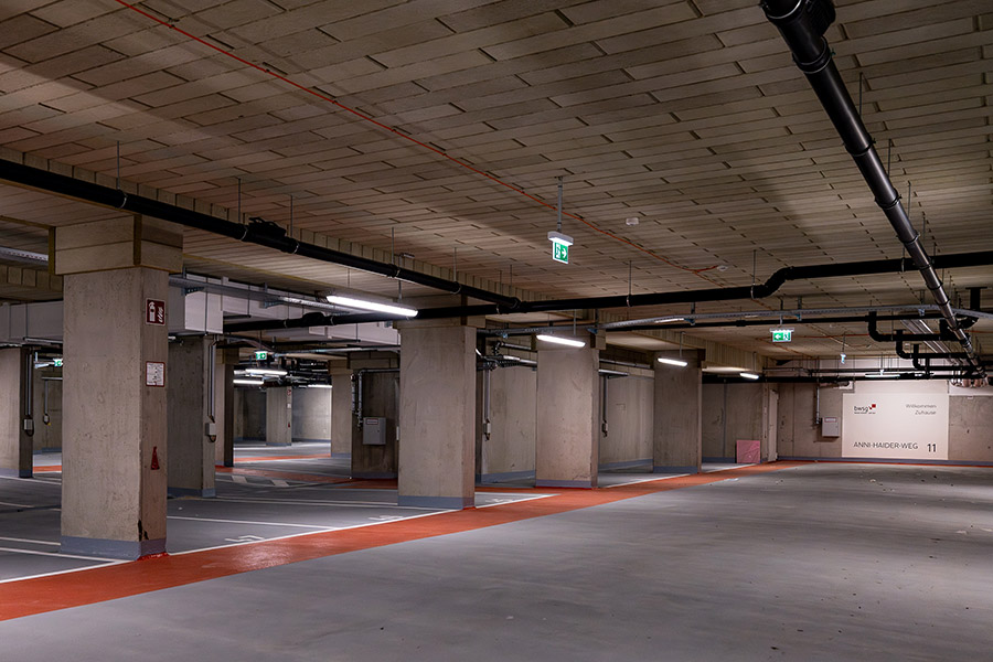 In der eingeschoßigen Tiefgarage können 104 PKWs untergebracht werden. Das Parkdeck des Nahversorgers bietet Platz für 31 weitere Stellplätze. Ebenfalls im Kellergeschoss befinden sich die Einlagerungs-, Fahrrad- und Technikräume. Die Müllräume, sowie die KIWA-AR sind bequem über einen ebenerdigen Zugang zu erreichen. Die Wohnungen erstrecken sich vom Erdgeschoss über 7. Stockwerke bis in das Dachgeschoss.