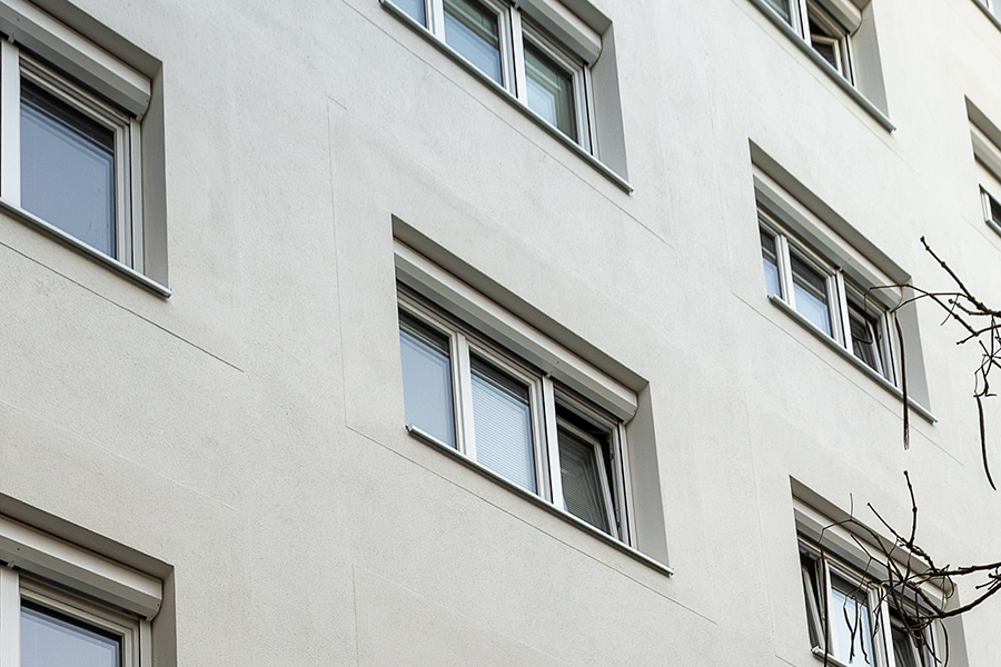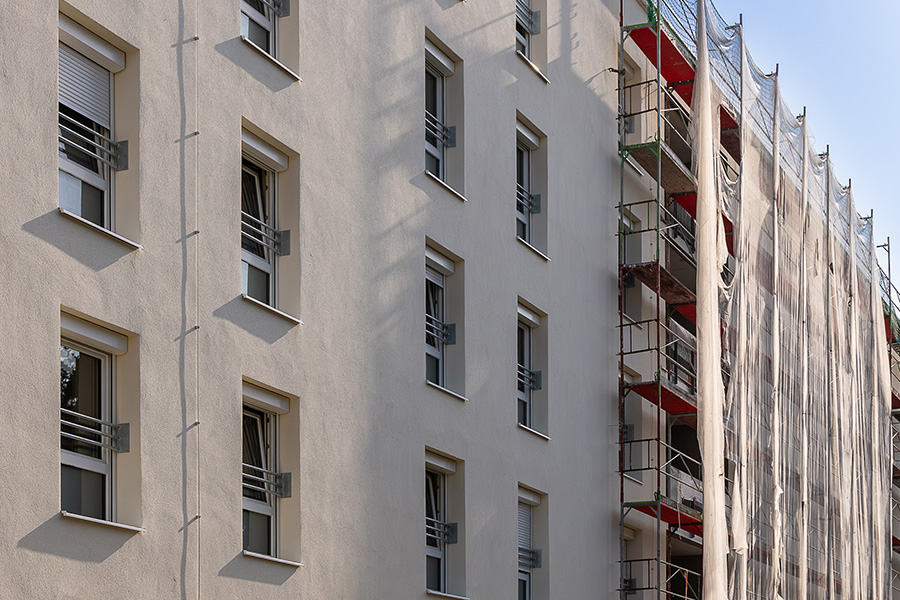 Im Bereich der neu eingebauten Fenster wird die vorhandene Vollwärmeschutzfassade ergänzt bzw. instandgesetzt. Zusätzlich wird die Kellerdecke gedämmt.