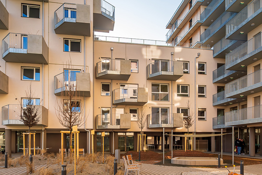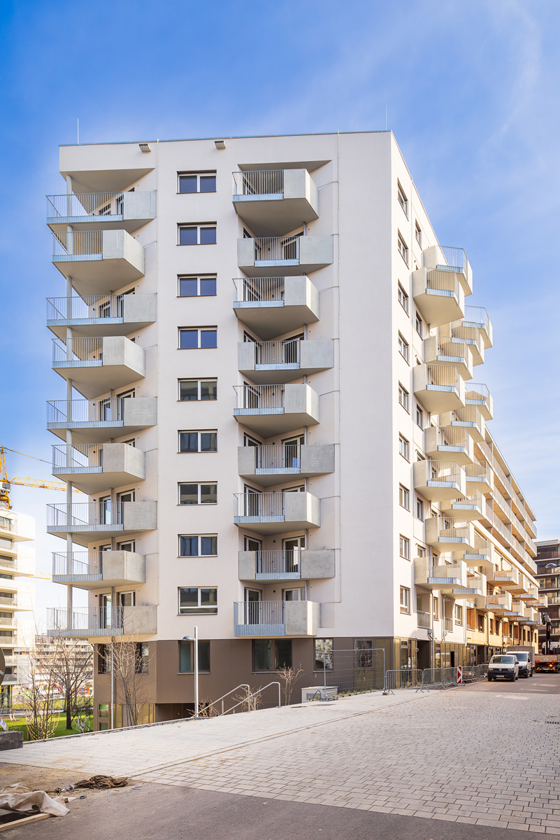 Die Wohnhausanlage beherbergt 1 bis 4 Zimmer Wohnungen mit großzügigen privaten Freibereichen in Form von Loggien oder Balkonen. Um der Anforderung nachhaltig Bauen und Wohnen gerecht zu werden, kommen in diesem Projekt mehrere Methoden zum Einsatz. Zum einen sorgen die begrünten Fassaden für die Verbesserung des Stadtklimas, zum anderen helfen Photovoltaikanlagen am Dach gemeinsam mit der Abwärme aus dem Abwasser warmes Wasser zu erzeugen. Die Ausstattung der Wohnhausanlage mit der Bauteilaktivierung zum Heizen im Sommer und Temperieren im Winter runden das Angebot an nachhaltigem Bauen für dieses Projekt ab.