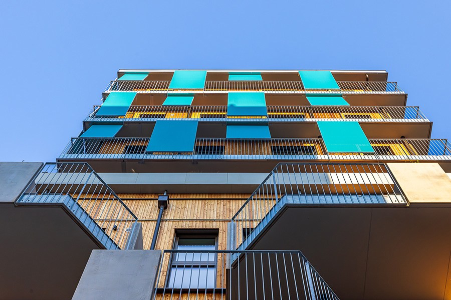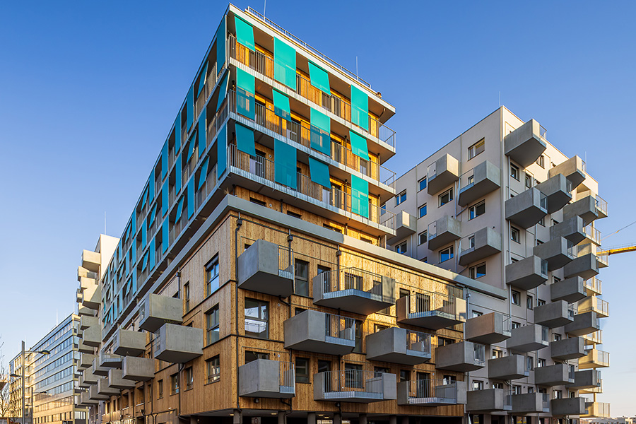Die Wände werden zum Teil in Holzbauweise und zum Teil in Massivbauweise ausgeführt. Als grüner Mantel sind verschiedene Formen der Fassadenbegrünung vorgesehen. Jeder Bewohner erhält eine Baumpatenschaft für einen Baum auf seinem Balkon, welche mittels eines intelligenten Regenwassermanagements in Trockenperioden mit Wasser versorgt werden.