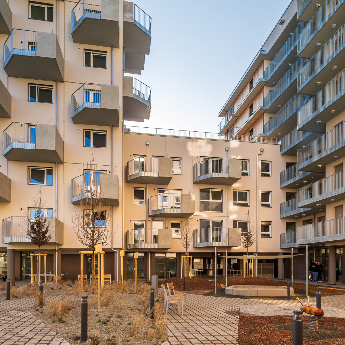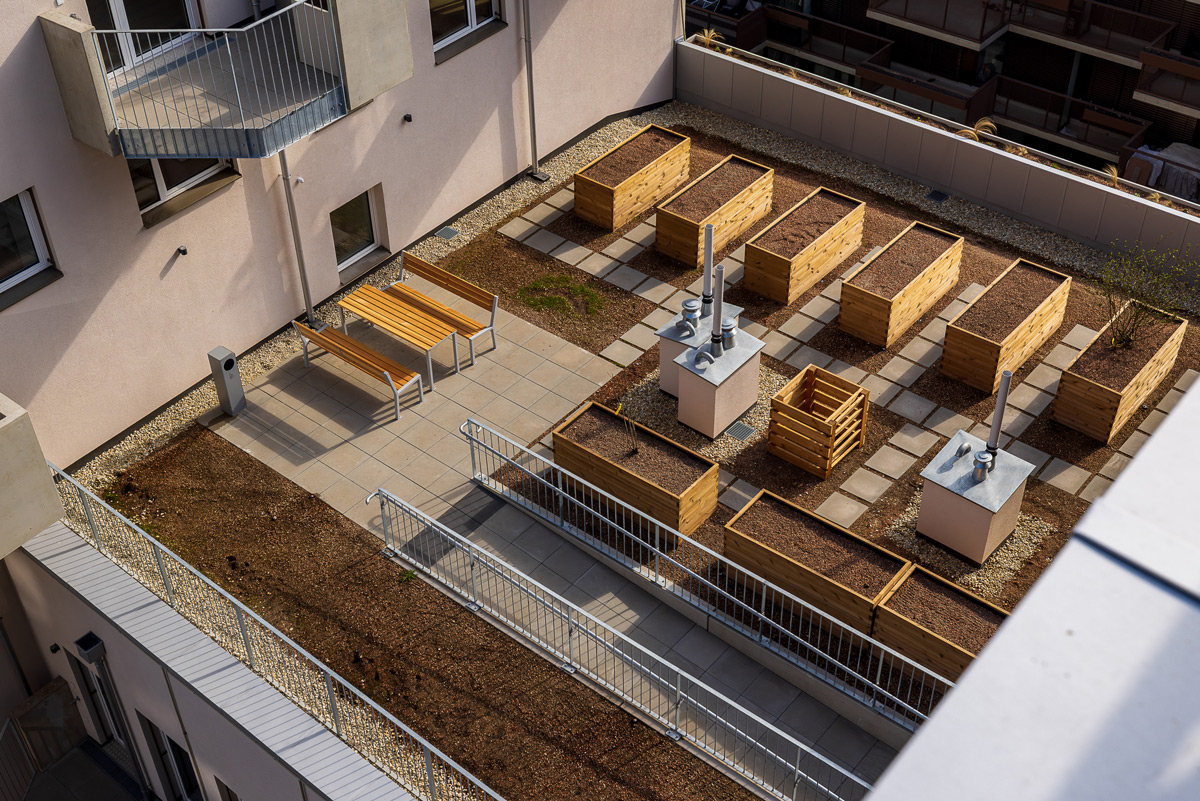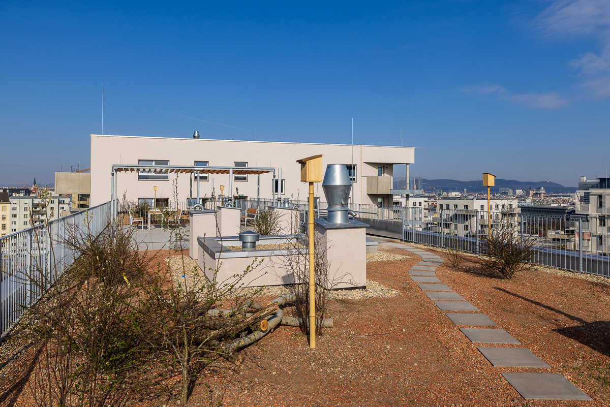 Das Bauprojekt verfügt weiters über einen Spielplatz im Innenhof, eine Gemeinschaftsterrasse im 4.OG und Bienenstöcke im 8.OG, welche vom Verein Stadtbienen angesiedelt und betreut werden.