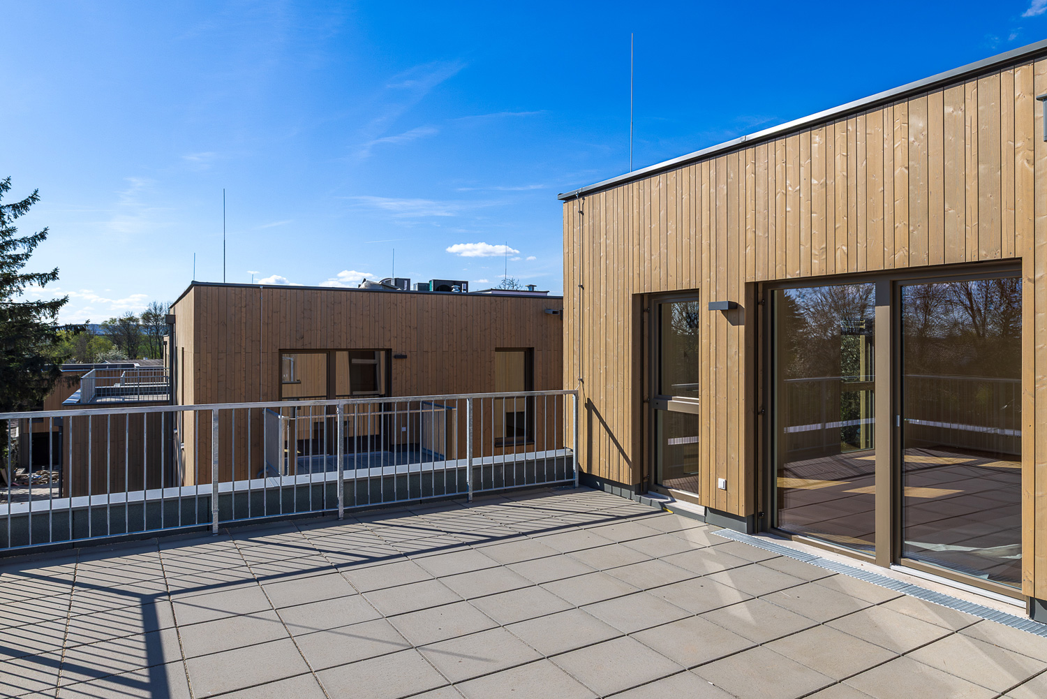 Ebenso stehen den Mietern in beiden Bauteilen zwei Gemeinschaftsterrassen im 3. Obergeschoss, 5 Gemeinschaftsräume, sowie 2 Gästewohnungen, die mit einer Loggia ausgestattet sind, zur Verfügung. Ein Kinderspielplatz im Innenhof wird ebenfalls errichtet.